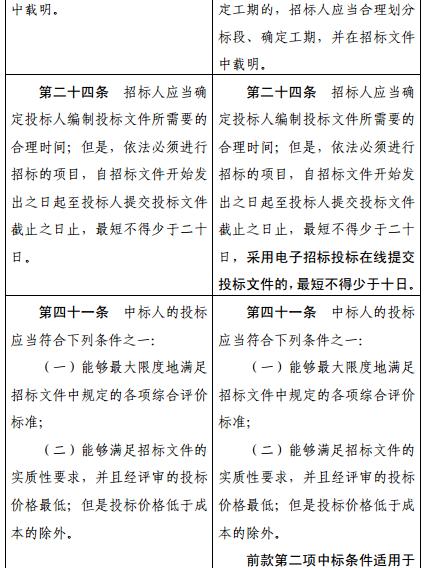 五、將第二十四條修改為:“招標(biāo)人應(yīng)當(dāng)確定投標(biāo)人編制投標(biāo)文件所需要的合理時(shí)間;但是,依法必須進(jìn)行招標(biāo)的項(xiàng)目,自招標(biāo)文件開(kāi)始發(fā)出之日起至投標(biāo)人提交投標(biāo)文件截止之日止,最短不得少于二十日,采用電子招標(biāo)投標(biāo)在線提交投標(biāo)文件的,最短不得少于十日?!?/p>