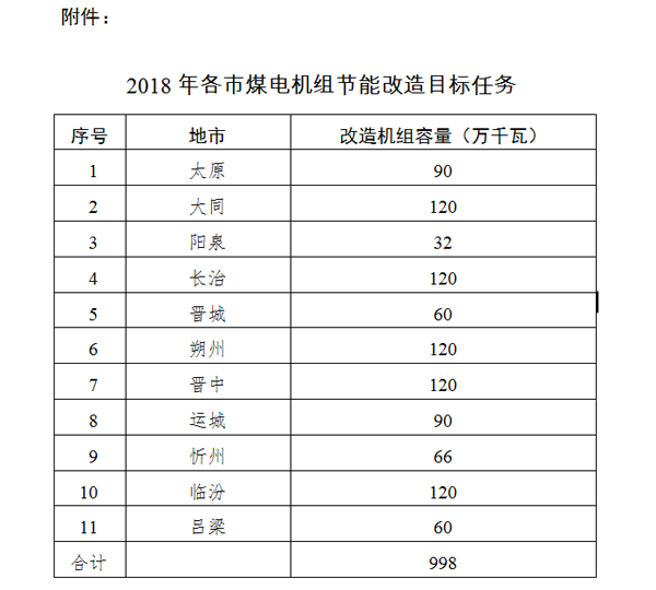 山西發(fā)布2018年各市煤電機(jī)組節(jié)能改造目標(biāo)任務(wù)