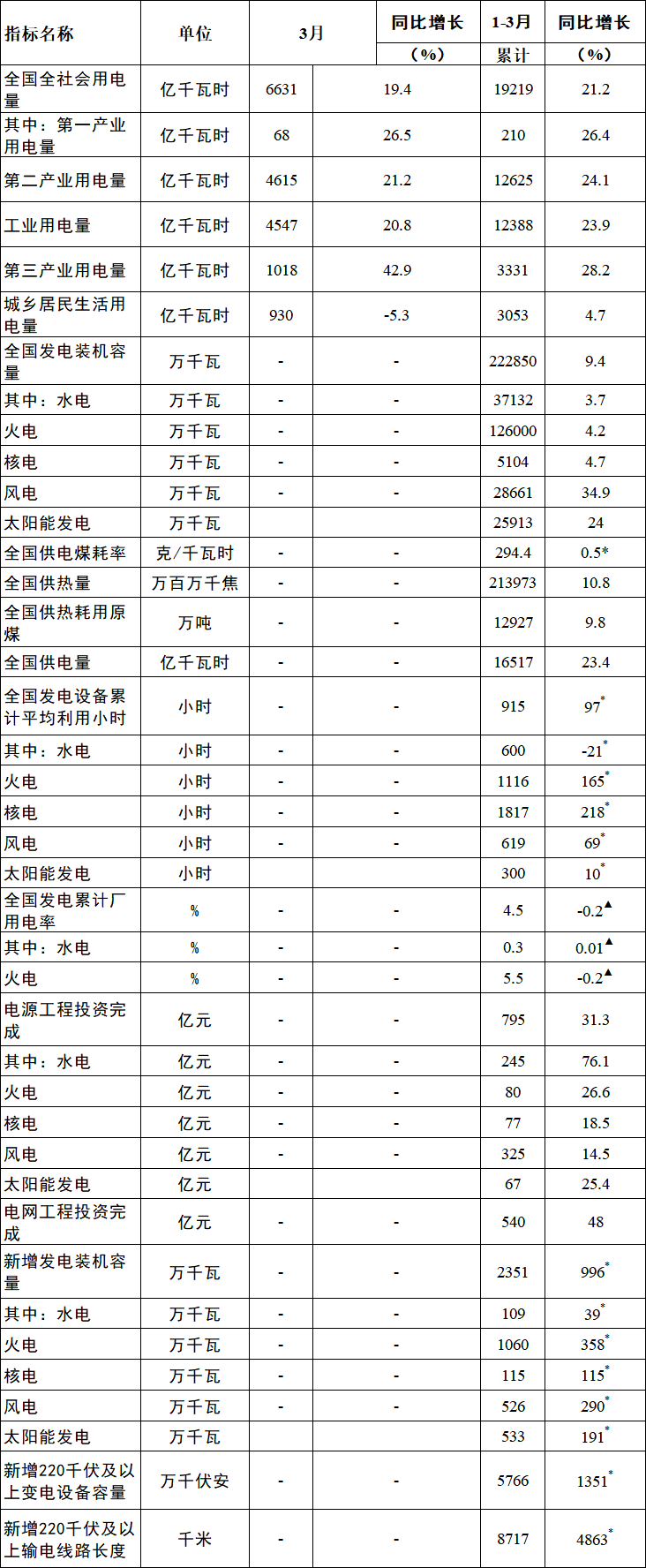 4月20日,國家能源局發布1-3月份全國電力工業統計數據。