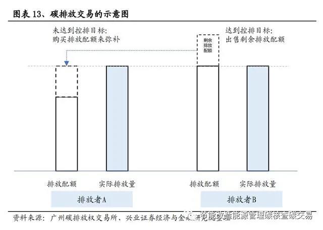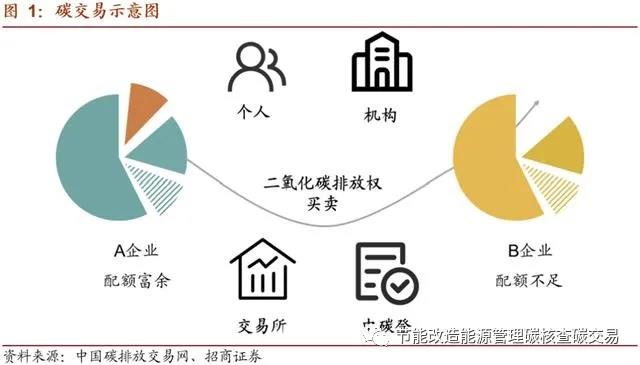碳交易市場(chǎng)是由政府通過對(duì)能耗企業(yè)的控制排放而人為制造的市場(chǎng)。通常情況下,政府確定一個(gè)碳排放總額,并根據(jù)一定規(guī)則將碳排放配額分配至企業(yè)。如果未來企業(yè)排放高于配額,需要到市場(chǎng)上購買配額。與此同時(shí),部分企業(yè)通過采用節(jié)能減排技術(shù),最終碳排放低于其獲得的配額,則可以通過碳交易市場(chǎng)出售多余配額。雙方一般通過碳排放交易所進(jìn)行交易。