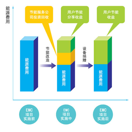 EMC 為客戶提供能源系統(tǒng)診斷、節(jié)能項(xiàng)目可行性分析、節(jié)能項(xiàng)目設(shè)計(jì),幫助項(xiàng)目融資,選擇并采購設(shè)備、安裝調(diào)試、進(jìn)行項(xiàng)目管理、培訓(xùn)操作人員、合同期內(nèi)系統(tǒng)設(shè)備維 護(hù)、節(jié)能量監(jiān)測等一條龍服務(wù),然后與客戶共同驗(yàn)證項(xiàng)目的節(jié)能效果、環(huán)境效益與經(jīng)濟(jì)效益,最后,與客戶分享項(xiàng)目實(shí)施后取得的經(jīng)濟(jì)效益,回收項(xiàng)目的投資和獲得 應(yīng)有的利潤。